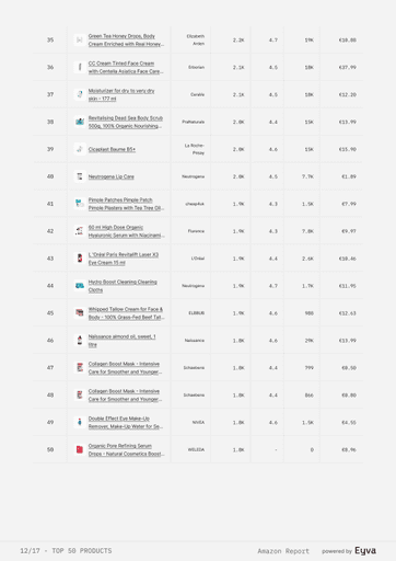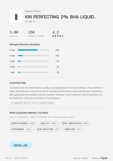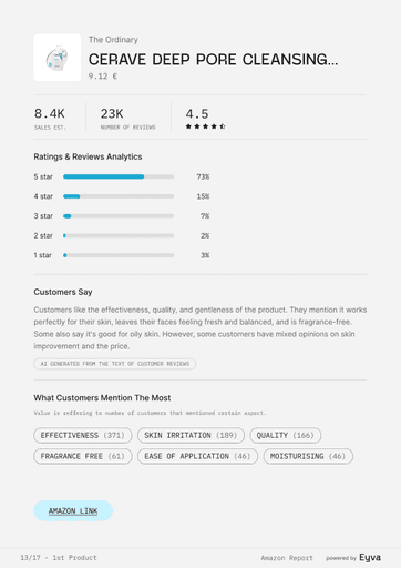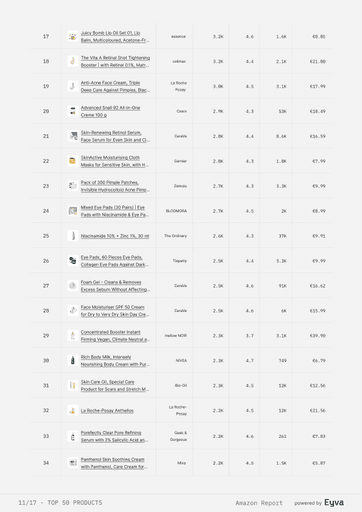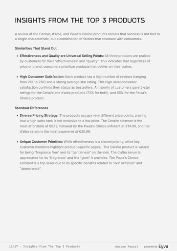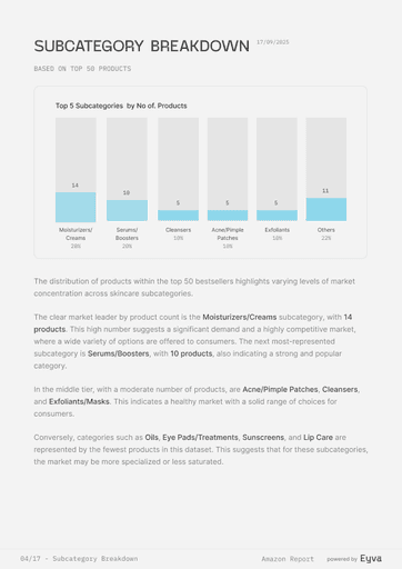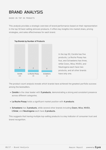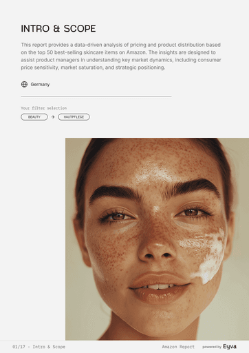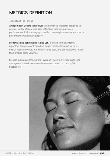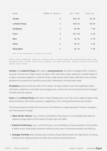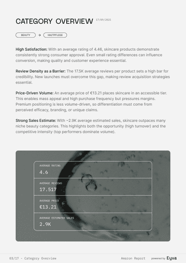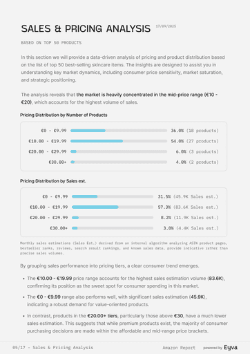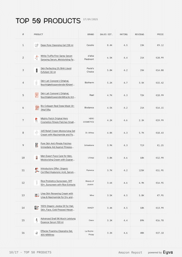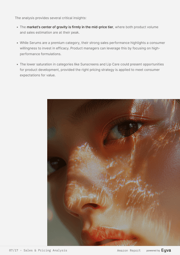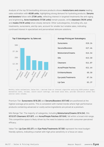 AMAZON SETS THE PACE IN BEAUTY, BUT MOST TEAMS STILL GUESS WHICH PRODUCTS WIN. EYVA’S AMAZON SKINCARE REPORT DELIVERS DATA ON PRICING, REVIEWS, AND BRAND PERFORMANCE, SHOWING HOW TOP BRANDS POSITION THEMSELVES—HELPING TEAMS PLAN LAUNCHES AND STRATEGY WITH CONFIDENCE.