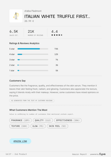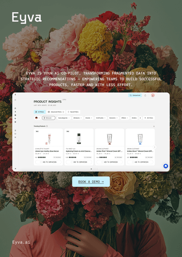Whether you’re planning a new launch, scouting competitors, or refining your portfolio, these insights replace assumptions with evidence. Eyva shows you what’s working on the biggest beauty marketplace now—before your competitors act on it.